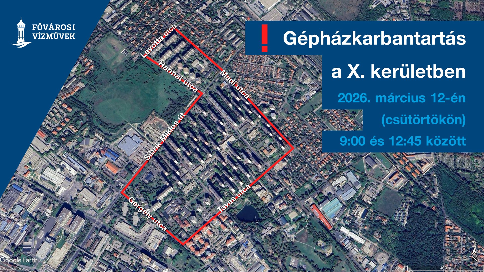 A munkálatok ideje alatt vízzavarosodás és nyomáscsökkenés, valamint az épületek magasabb szintjein vízhiány is előfordulhat a Mádi utca – Lavotta utca – Harmat utca – Sibrik Miklós utca – Gergely utca – Tavas utca által határolt területen.